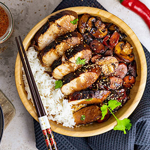 10   Готовый рис разложить по тарелкам, куриную грудку нарезать ровными ломтиками и выложить на рис с овощами. Полить соусом терияки, посыпать свежим кориандром, подать к столу.